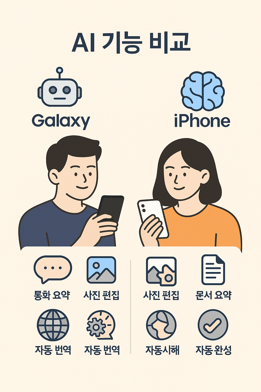AI 기능 갤럭시 AI 2.0 (문서요약·통역·사진편집) Apple Intelligence (상황별 자동추천)