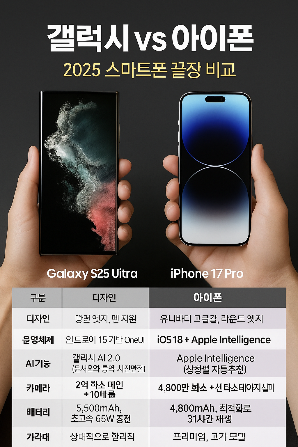 둘 다 최신 모델(Galaxy S25 Ultra, iPhone 17 Pro)을 출시하며